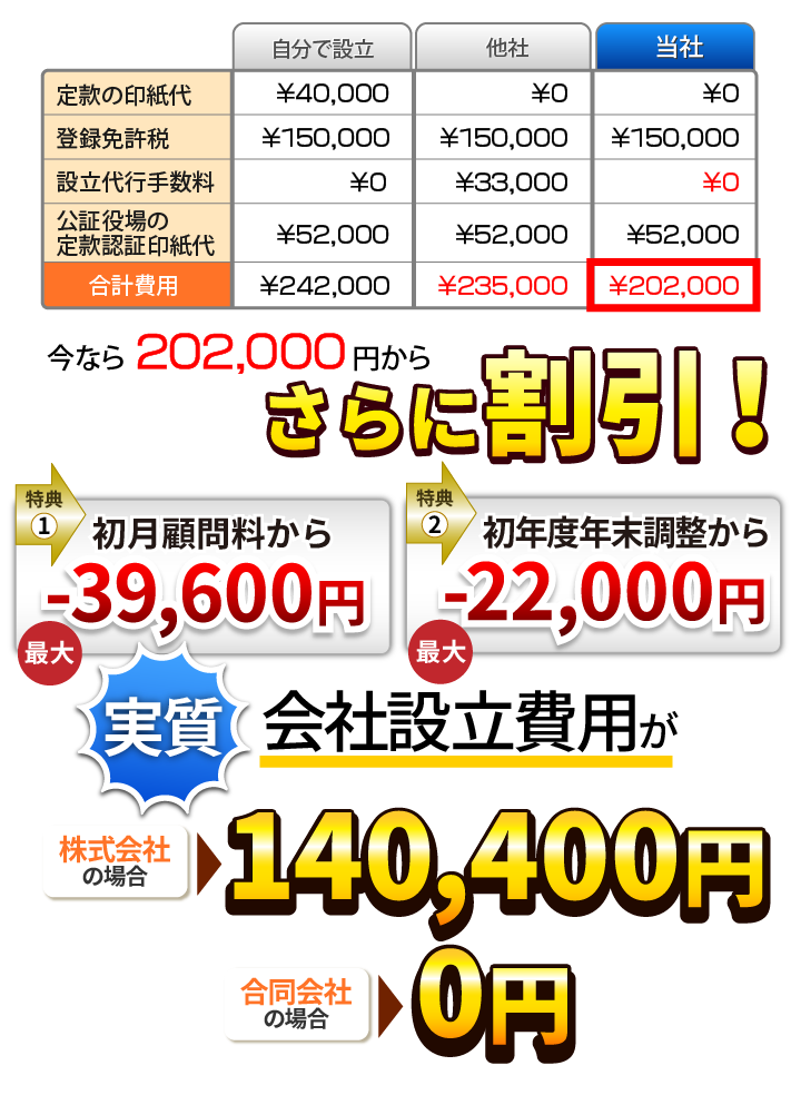 ※顧問契約後の初月顧問料、初年度末調整からそれぞれ上記価格をお値引きいたします。