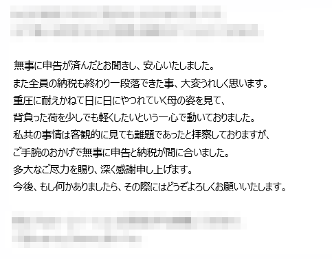 ご手腕のおかげで無事に申告と納税が間に合いました。