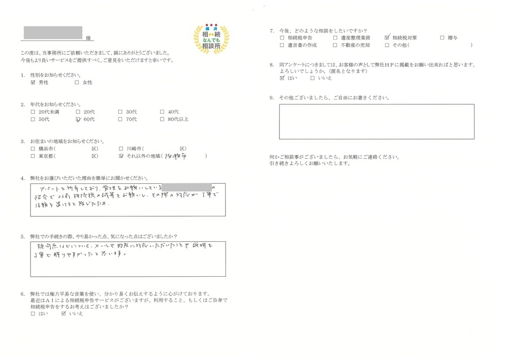 アパートを所有しており、管理をお願いしている不動産会社の紹介で以前相続税の試算をお願いし、その際の対応が丁寧で信頼を置けると感じたため。